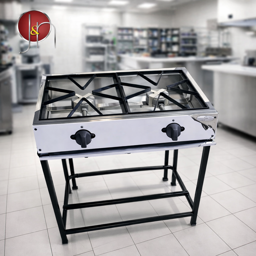 Cocina a gas industrial de dos quemadores, fabricada en acero al carbono con parrillas superiores reforzadas. Diseñada para cocción directa en cocinas comerciales, restaurantes y operaciones alimentarias de alta demanda.