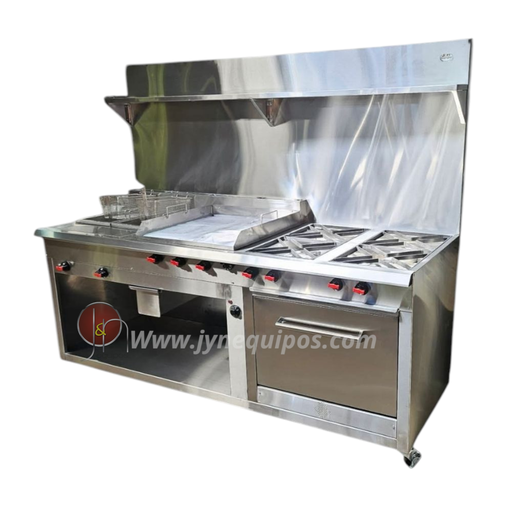 Cocina industrial combinada con cuatro quemadores abiertos y dos freidores integrados, equipada con campana superior de extracción. Diseñada para cocinas comerciales que requieren cocción y fritura en un solo módulo compacto. Fabricada en acero inoxidable con estructura reforzada para operación continua.